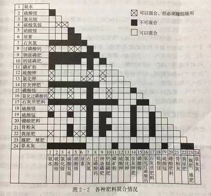 不同肥料在混配时,必须要把握的几个原则发表时间:2025-06-27 15:10 不同肥料在混配时,必须要把握以下这几个原则: (1)混合后,养分配比要适应于当地的土壤特点和作物需要。 草木灰等碱性肥料不能与硫酸铵、碳酸氢铵、氯化铵等铵态氮肥混用,会增加氮的挥发损失,降低肥效。 过磷酸钙不能与草木灰、石灰氮、石灰等碱性物质混用。因为过磷酸钙含有游离酸,呈酸性,上述碱性物质含钙质较多,两者混用会引起酸碱中和反应,降低肥效,钙还会固定磷元素。 碳铵不能与菌肥混用。碳铵会散发一定浓度的氨气,对菌肥里的活性菌有毒害作用。 磷肥不能与锌元素混用。磷和锌产生化学反应,形成磷酸锌,降低磷和锌的利用率。 农家肥不能与碱性肥料混用。人畜粪尿中的主要成分是氮,若与强碱性肥料混用,则会中和而失效。 化肥不能与菌肥混用。化肥有较强的腐蚀性、挥发性和吸水性,和细菌性肥料混合施用的话,会杀伤或抑制活菌体使细菌性肥料失效。 难溶性磷肥不能与碱性肥料混用。难溶性磷肥包括磷矿粉、骨粉等,这些肥料与碱性肥料混合,会更难溶解于水。 具体的肥料间是否可以混合,大家可以参考下面这张图片: